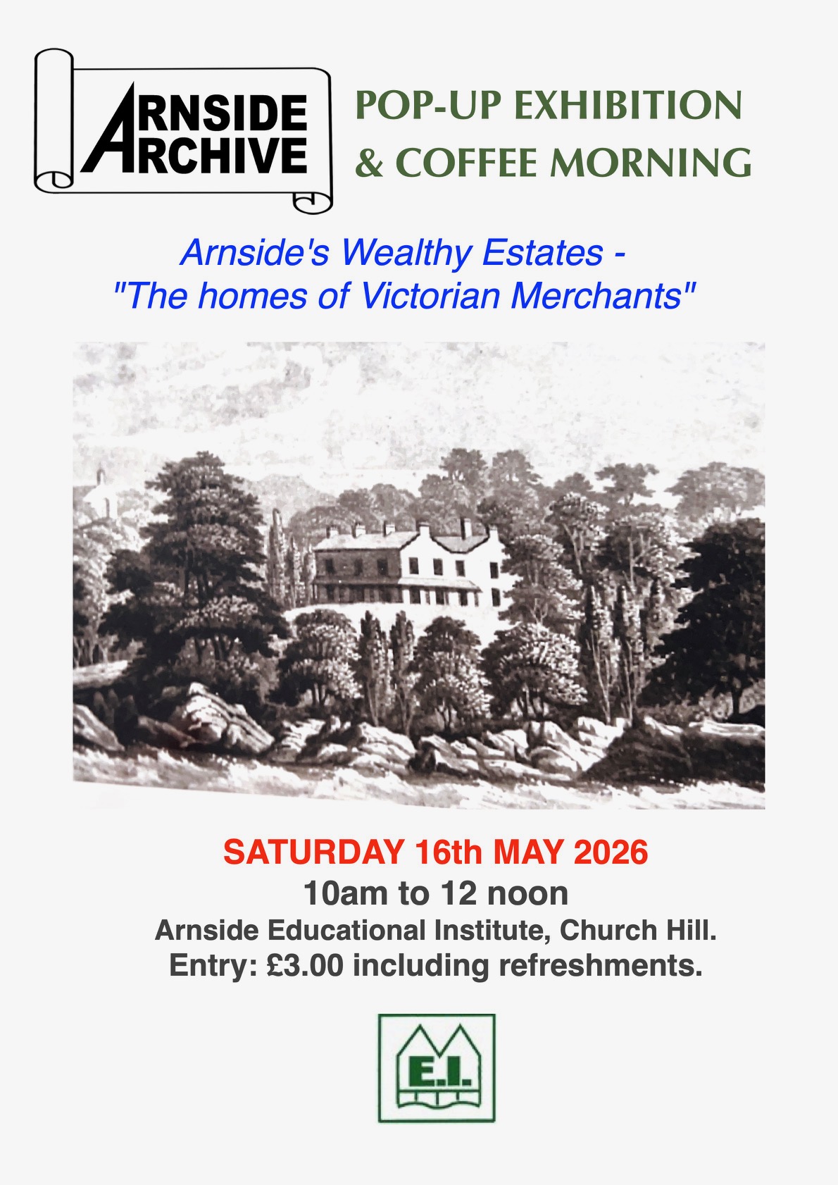 Our next event will be a coffee morning, on Saturday 16th May 2026 at the Educational Institute, Church Hill, Arnside. Pop-up exhibition: “Arnside’s Wealthy Estates - the homes of Victorian merchants”.